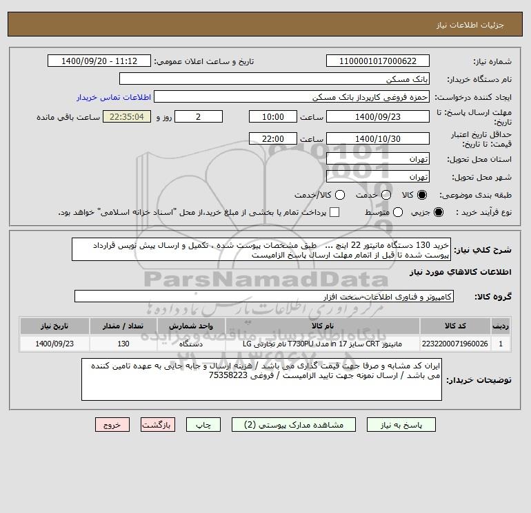 شرح کلی نیاز: خرید 130 دستگاه مانیتور 22 اینچ ... طبق مشخصات پیوست شده ، تکمیل و ارسال پیش نویس قرارداد پیوست شده تا قبل از اتمام مهلت ارسال پاسخ الزامیست
