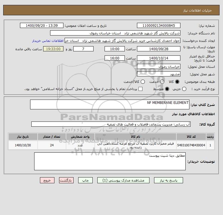 شرح کلی نیاز: NF MEMBERANE ELEMENT