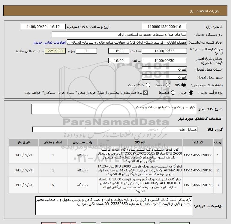 شرح کلی نیاز: کولر اسپیلت و داکت با توضیحات پیوست