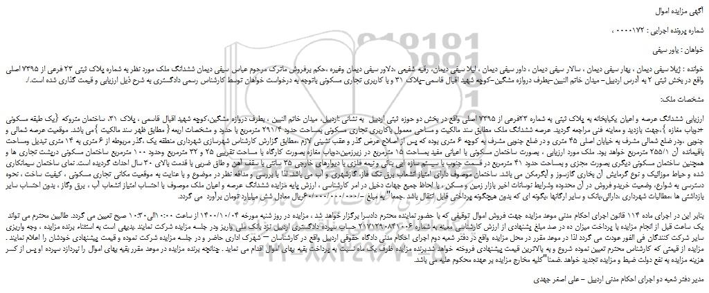 خوانده : ژیلا سیفی دیمان ، بهار سیفی دیمان ، سالار سیفی دیمان ، داور سیفی دیمان ، لیلا سیفی دیمان، رقیه شفیعی ،دلاور سیفی دیمان وغیره ،حکم برفروش ماترک مرحوم عباس سیفی دیمان ششدانگ ملک مورد نظر به شماره پلاک ثبتی 23 فرعی از 7395 اصلی واقع در بخش ثبتی 2 به آدرس اردبیل- میدان خاتم النبین-بطرف دروازه مشگین-کوچه شهید اقبال قاسمی-پلاک 31 و با کاربری تجاری مسکونی باتوجه به درخواست خواهان توسط کارشناس رسمی دادگستری به شرح ذیل ارزیابی و قیمت گذاری شده است./.
