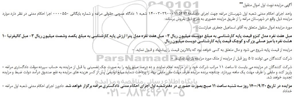 مزایده در تاریخ 1400/9/30 روز سه شنبه ساعت 11 صبح بصورت حضوری در دفترشعبه اول اجرای احکام مدنی دادگستری مراغه برگزار خواهد شد. دادورز اجرای احکام مدنی شعبه اول مراغه - خداداد