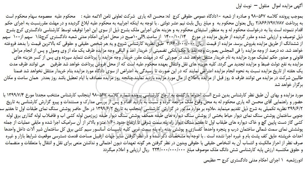 بموجب پرونده کلاسه 980567 و صادره از شعبه 10دادگاه عمومی حقوقی کرج له: محسن اله یاری شرکت تعاونی ثامن الائمه علیه : محکوم علیه معصومه سهام محکوم است به پرداخت 2/866/797/787 ریال بعنوان محکوم به و مبلغ ریال بابت نیم عشر دولتی . با توجه به اینکه اجراییه به محکوم علیه ابلاغ گردیده و در مهلت مقررنسبت به اجرای حکم اقدام ننموده است بنا به درخواست محکوم له و به منظور استیفای محکوم به و هزینه های اجرایی ملک بشرح ذیل از سوی این اجرا توقیف توسط کارشناسی دادگستری کرج بشرح ذیل توصیف و ارزیابی شده و مقرر گردیده از طریق مزایده در مورخ 1400/10/14 از ساعت 9الی10صبح در محل اجرای احکام مدنی شعبه دادگستری کرج 1/5 سهم از100 سهم از ششدانگ از طریق مزایده بفروش برسد. مزایده از قیمت ریال 3/660/000/000 طبق نظریه کارشناس شروع و به هر شخص حقیقی و حقوقی که بالاترین قیمت را بدهد فروخته خواهد شد. ده درصد از وجه مزایده را فی المجلس بصورت وجه نقد یا چک بانکی تضمینی از خریدار اخذ و الباقی وجه مزایده ظرف یک ماه از وی وصول و پس از انجام مراحل قانونی و صدور حکم تملیک مورد مزایده به نام خریدار منتقل خواهد شد. در صورتی که در مهلت مقرر خریدار وجه مزایده را پرداخت ننماید سپرده وی پس از کسر هزینه های مزایده به نفع دولت ضبط و مزایده تجدید می گردد. کلیه هزینه های نقل وانتقال بعهده محکوم علیه است که از محل فروش پرداخت خواهد شد طرفین می توانند ظرف مدت یک هفته از تاریخ مزایده نسبت به نحوه انجام مزایده اعتراض نمایند که در این صورت تا رسیدگی به اعتراض از سوی دادگاه مورد مزایده بنام خریدار منتقل نخواهد شد ضمنا طالبین شرکت در مزایده می توانند ظرف 5 روز قبل از مزایده بااطلاع از مال مورد مزایده بازدید نمایند.چنانجه روز مزایده مصادف با ایام تعطیل باشد روز بعددر همان ساعت و مکان برگزار خواهد شد
