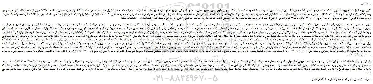 آگهی مزایده اموال شماره پرونده اجرایی : 9901966 شعبه اول اجرای احکام مدنی دادگستری شهرستان اردبیل در راستای دادنامه واصله شعبه اول دادگاه عمومی حقوقی اردبیل مطروحه مابین، محکوم له چنگیز نوبهارو محکوم علیه خسرو جعفری محکوم است به مبلغ1/910/000/00ریال اصل خواسته ومبلغ66/410/728ریال هزینه دادرسی ومبلغ83/220/000ریال بابت حق الوکاله وکیل مرحله بدوی وخسارت تاخیر تادیه از سررسید چک1398/01/01لغایت اجرای حکم درحق محکوم لها ومبلغ95/500/000ریال نیم عشر دولتی درحق صندوق دولت ،باتوجه به درخواست توقیف وفروش اموال محکوم علیه دو دانگ مشاع از شش دانگ عرصه و اعیان به استثناء بهای ثمنیه عرصه و اعیان یک دستگاه آپارتمان مسکونی ( وضعیت خاص طلق ) به شماره 16931 فرعی از 7552 اصلی قطعه دو تفکیکی مفروز و مجزی شده از 5 فرعی از اصلی مذکور واقع در بخش 2 واقع در اردبیل – خیابان حافظ – کوچه شقایق ، ارزیابی در طبقات اول و دوم یک ساختمان تجاری- مسکونی ( طبقه همکف تجاری ، دو طبقه مسکونی )به شرح ذیل ارزیابی و قیمت گذاری شده است./. مشخصات ملک: