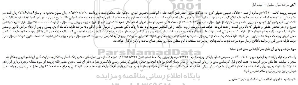بموجب پرونده کلاسه 977470و صادره از شعبه 10دادگاه عمومی حقوقی کرج له: شرکت تعاونی اعتبار ثامن الائمه علیه : ابوالقاسم محمودی انوری محکوم علیه محکوم است به پرداخت 945/397/139 ریال بعنوان محکوم به و مبلغ47/269/856 ریال بابت نیم عشر دولتی . با توجه به اینکه اجراییه به محکوم علیه ابلاغ گردیده و در مهلت مقررنسبت به اجرای حکم اقدام ننموده است بنا به درخواست محکوم له و به منظور استیفای محکوم به و هزینه های اجرایی ملک بشرح ذیل از سوی این اجرا توقیف توسط کارشناسی دادگستری کرج بشرح ذیل توصیف و ارزیابی شده و مقرر گردیده از طریق مزایده در مورخ 1400/9/23 از ساعت 9الی10صبح در محل اجرای احکام مدنی شعبه دادگستری کرج از طریق مزایده بفروش برسد. مزایده از قیمت 69/000/000 ریال طبق نظریه کارشناس شروع و به هر شخص حقیقی و حقوقی که بالاترین قیمت را بدهد فروخته خواهد شد. ده درصد از وجه مزایده را فی المجلس بصورت وجه نقد یا چک بانکی تضمینی از خریدار اخذ و الباقی وجه مزایده ظرف یک ماه از وی وصول و پس از انجام مراحل قانونی و صدور حکم تملیک مورد مزایده به نام خریدار منتقل خواهد شد. در صورتی که در مهلت مقرر خریدار وجه مزایده را پرداخت ننماید سپرده وی پس از کسر هزینه های مزایده به نفع دولت ضبط و مزایده تجدید می گردد. کلیه هزینه های نقل وانتقال بعهده محکوم علیه است که از محل فروش پرداخت خواهد شد طرفین می توانند ظرف مدت یک هفته از تاریخ مزایده نسبت به نحوه انجام مزایده اعتراض نمایند که در این صورت تا رسیدگی به اعتراض از سوی دادگاه مورد مزایده بنام خریدار منتقل نخواهد شد ضمنا طالبین شرکت در مزایده می توانند ظرف 5 روز قبل از مزایده بااطلاع از مال مورد مزایده بازدید نمایند.چنانجه روز مزایده مصادف با ایام تعطیل باشد روز بعددر همان ساعت و مکان برگزار خواهد شد