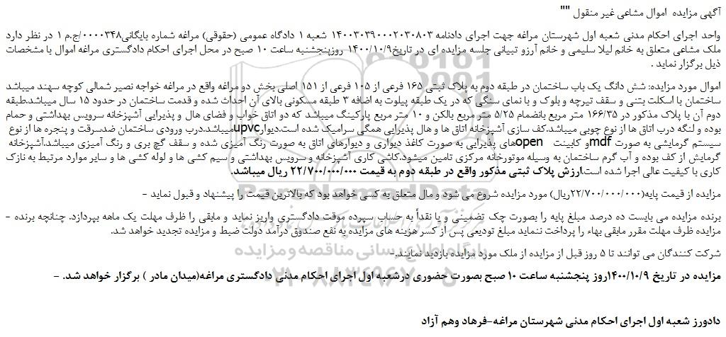 - مزایده در تاریخ 1400/10/9روز پنجشنبه ساعت 10 صبح بصورت حضوری درشعبه اول اجرای احکام مدنی دادگستری مراغه(میدان مادر ) برگزار خواهد شد.