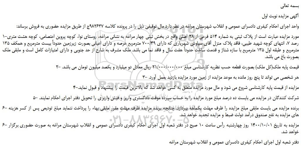 1-مورد مزایده عبارت است از پلاک ثبتی به شماره 514 فرعی از 28 اصلی واقع در بخش ثبتی چهار مراغه به نشانی مراغه، روستای نوا، کوچه پروین اعتصامی، کوچه هشت متری رصد 7، انتهای کوچه شهید طیبی، فاقد پلاک منزل آقای سیاوش شهریاری که دارای 700/49 مترمربع عرصه و دارای اعیانی بصورت زیرزمین حدوداً بیست مترمربع و همکف 135 مترمربع و طبقه اول 135 مترمربع با سازه شناژ و قدمت ساخت حدوداً هفت سال و فاقد نما می باشد. ملک مشرف به شارع از حد جنوبی و دارای امتیازات کامل است و مابقی ملک بصورت باغ می باشد.