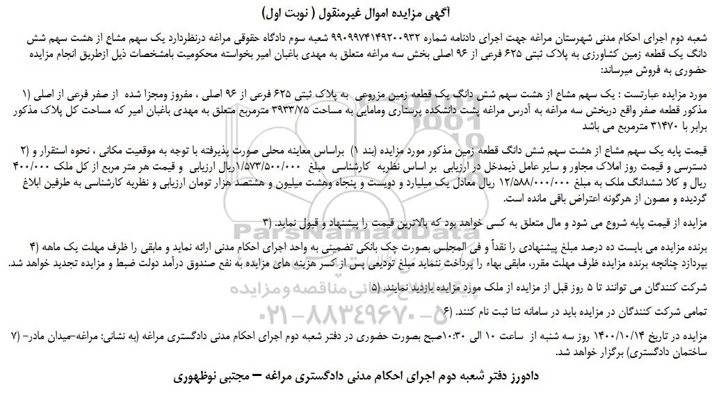شعبه دوم اجرای احکام مدنی شهرستان مراغه جهت اجرای دادنامه شماره 9909974149200932 شعبه سوم دادگاه حقوقی مراغه درنظردارد یک سهم مشاع از هشت سهم شش دانگ یک قطعه زمین کشاورزی به پلاک ثبتی 625 فرعی از 96 اصلی بخش سه مراغه متعلق به مهدی باغبان امیر بخواسته محکومیت بامشخصات ذیل ازطریق انجام مزایده حضوری به فروش میرساند: