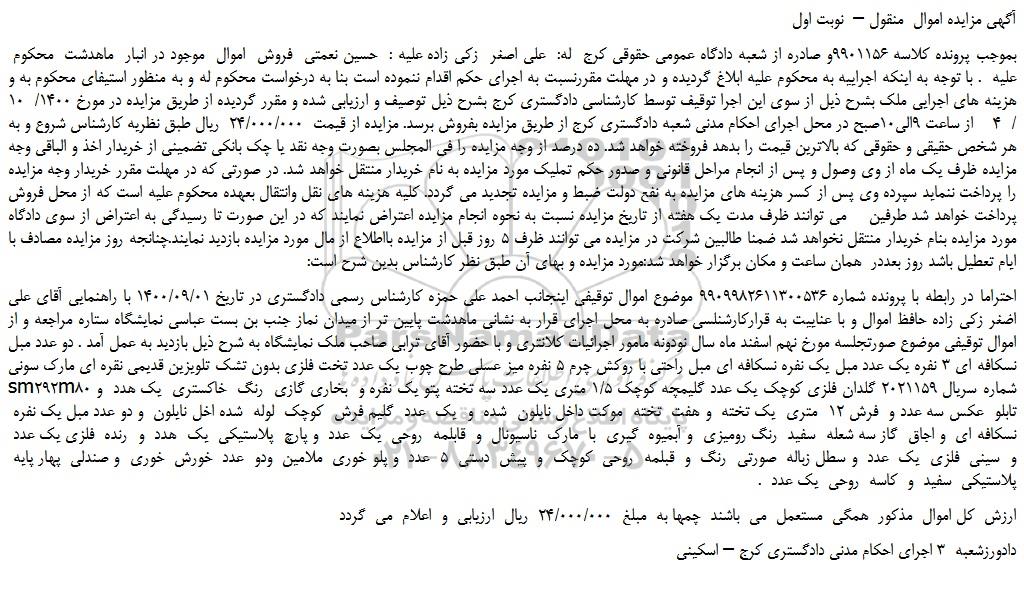 بموجب پرونده کلاسه 9901156و صادره از شعبه دادگاه عمومی حقوقی کرج له: علی اصغر زکی زاده علیه : حسین نعمتی فروش اموال موجود در انبار ماهدشت محکوم علیه . با توجه به اینکه اجراییه به محکوم علیه ابلاغ گردیده و در مهلت مقررنسبت به اجرای حکم اقدام ننموده است بنا به درخواست محکوم له و به منظور استیفای محکوم به و هزینه های اجرایی ملک بشرح ذیل از سوی این اجرا توقیف توسط کارشناسی دادگستری کرج بشرح ذیل توصیف و ارزیابی شده و مقرر گردیده از طریق مزایده در مورخ 1400/ 10 / 4 از ساعت 9الی10صبح در محل اجرای احکام مدنی شعبه دادگستری کرج از طریق مزایده بفروش برسد. مزایده از قیمت 24/000/000 ریال طبق نظریه کارشناس شروع و به هر شخص حقیقی و حقوقی که بالاترین قیمت را بدهد فروخته خواهد شد. ده درصد از وجه مزایده را فی المجلس بصورت وجه نقد یا چک بانکی تضمینی از خریدار اخذ و الباقی وجه مزایده ظرف یک ماه از وی وصول و پس از انجام مراحل قانونی و صدور حکم تملیک مورد مزایده به نام خریدار منتقل خواهد شد. در صورتی که در مهلت مقرر خریدار وجه مزایده را پرداخت ننماید سپرده وی پس از کسر هزینه های مزایده به نفع دولت ضبط و مزایده تجدید می گردد. کلیه هزینه های نقل وانتقال بعهده محکوم علیه است که از محل فروش پرداخت خواهد شد طرفین می توانند ظرف مدت یک هفته از تاریخ مزایده نسبت به نحوه انجام مزایده اعتراض نمایند که در این صورت تا رسیدگی به اعتراض از سوی دادگاه مورد مزایده بنام خریدار منتقل نخواهد شد ضمنا طالبین شرکت در مزایده می توانند ظرف 5 روز قبل از مزایده بااطلاع از مال مورد مزایده بازدید نمایند.چنانجه روز مزایده مصادف با ایام تعطیل باشد روز بعددر همان ساعت و مکان برگزار خواهد شد:مورد مزایده و بهای آن طبق نظر کارشناس بدین شرح است:
