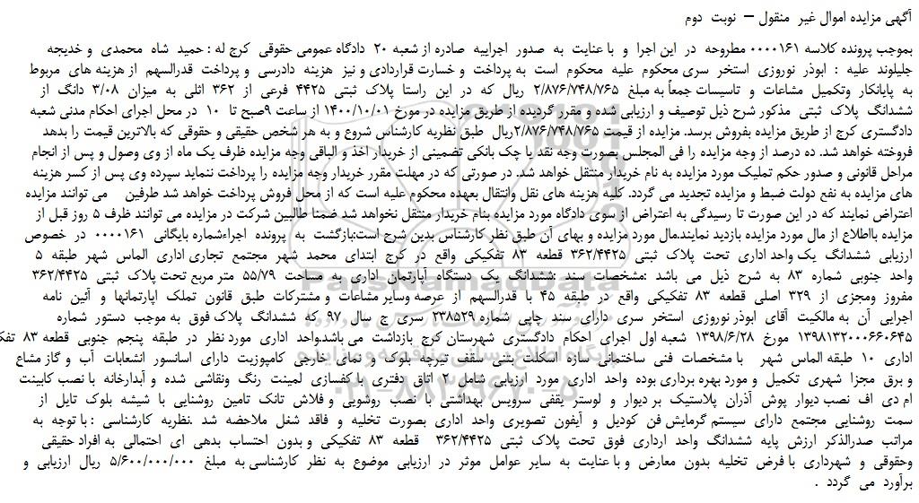 بموجب پرونده کلاسه 0000161 مطروحه در این اجرا و با عنایت به صدور اجراییه صادره از شعبه 20 دادگاه عمومی حقوقی کرج له : حمید شاه محمدی و خدیجه جلیلوند علیه : ابوذر نوروزی استخر سری محکوم علیه محکوم است به پرداخت و خسارت قراردادی و نیز هزینه دادرسی و پرداخت قدرالسهم از هزینه های مربوط به پایانکار وتکمیل مشاعات و تاسیسات جمعاً به مبلغ 2/876/748/765 ریال که در این راستا پلاک ثبتی 4425 فرعی از 362 اثلی به میزان 3/08 دانگ از ششدانگ پلاک ثبتی مذکور شرح ذیل توصیف و ارزیابی شده و مقرر گردیده از طریق مزایده در مورخ 1400/10/01 از ساعت 9صبح تا 10 در محل اجرای احکام مدنی شعبه دادگستری کرج از طریق مزایده بفروش برسد. مزایده از قیمت 2/876/748/765ریال طبق نظریه کارشناس شروع و به هر شخص حقیقی و حقوقی که بالاترین قیمت را بدهد فروخته خواهد شد. ده درصد از وجه مزایده را فی المجلس بصورت وجه نقد یا چک بانکی تضمینی از خریدار اخذ و الباقی وجه مزایده ظرف یک ماه از وی وصول و پس از انجام مراحل قانونی و صدور حکم تملیک مورد مزایده به نام خریدار منتقل خواهد شد. در صورتی که در مهلت مقرر خریدار وجه مزایده را پرداخت ننماید سپرده وی پس از کسر هزینه های مزایده به نفع دولت ضبط و مزایده تجدید می گردد. کلیه هزینه های نقل وانتقال بعهده محکوم علیه است که از محل فروش پرداخت خواهد شد طرفین می توانند مزایده اعتراض نمایند که در این صورت تا رسیدگی به اعتراض از سوی دادگاه مورد مزایده بنام خریدار منتقل نخواهد شد ضمنا طالبین شرکت در مزایده می توانند ظرف 5 روز قبل از مزایده بااطلاع از مال مورد مزایده بازدید نمایند.مال مورد مزایده و بهای آن طبق نظر کارشناس بدین شرح است:بازگشت به پرونده اجراءشماره بایگانی 0000161 در خصوص ارزیابی ششدانگ یک واحد اداری تحت پلاک ثبتی 362/4425 قطعه 83 تفکیکی واقع در کرج ابتدای محمد شهر مجتمع تجاری اداری الماس شهر طبقه 5 واحد جنوبی شماره 83 به شرح ذیل می باشد :مشخصات سند :ششدانگ یک دستگاه آپارتمان اداری به مساحت 55/79 متر مربع تحت پلاک ثبتی 362/4425 مفروز ومجزی از 329 اصلی قطعه 83 تفکیکی واقع در طبقه 45 با قدرالسهم از عرصه وسایر مشاعات و مشترکات طبق قانون تملک اپارتمانها و آئین نامه اجرایی آن به مالکیت آقای ابوذر نوروزی استخر سری دارای سند چاپی شماره 238529 سری ج سال 97 که ششدانگ پلاک فوق به موجب دستور شماره 1398132000660645 مورخ 1398/6/28 شعبه اول اجرای احکام دادگستری شهرستان کرج بازداشت می باشد.واحد اداری مورد نظر در طبقه پنجم جنوبی قطعه 83 تفکیکی در مجتمع اداری 10 طبقه الماس شهر با مشخصات فنی ساختمانی سازه اسکلت بتنی سقف تیرچه بلوک و نمای خارجی کامپوزیت دارای اسانسور انشعابات آب و گاز مشاع و برق مجزا شهری تکمیل و مورد بهره برداری بوده واحد اداری مورد ارزیابی شامل 2 اتاق دفتری با کفسازی لمینت رنگ ونقاشی شده و آبدارخانه با نصب کابینت ام دی اف نصب دیوار پوش آذران پلاستیک بر دیوار و لوستر یقفی سرویس بهداشتی با نصب روشویی و فلاش تانک تامین روشنایی با شیشه بلوک تایل از سمت روشنایی مجتمع دارای سیستم گرمایش فن کودیل و آیفون تصویری واحد اداری بصورت تخلیه و فاقد شغل ملاحضه شد .نظریه کارشناسی : با توجه به مراتب صدرالذکر ارزش پایه ششدانگ واحد ارداری فوق تحت پلاک ثبتی 362/4425 قطعه 83 تفکیکی و بدون احتساب بدهی ای احتمالی به افراد حقیقی وحقوقی و شهرداری با فرض تخلیه بدون معارض و با عنایت به سایر عوامل موثر در ارزیابی موضوع به نظر کارشناسی به مبلغ 5/600/000/000 ریال ارزیابی و برآورد می گردد .