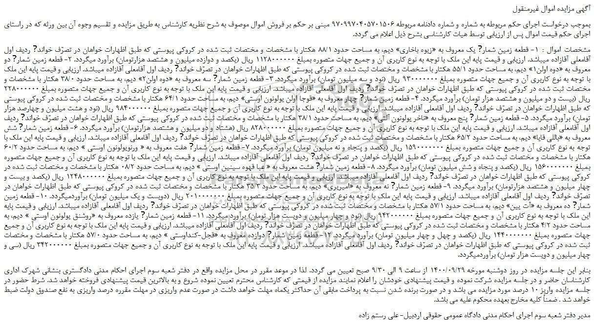 مشخصات اموال : 1- قطعه زمین شمار? یک معروف به «زیوه باخاری» دیم، به مساحت حدود 88/1 هکتار با مشخصات و مختصات ثبت شده در کروکی پیوستی که طبق اظهارات خواهان در تصرّف خواند? ردیف اول آقامعلی آقازاده میباشد. ارزیابی و قیمت پایه این ملک با توجه به نوع کاربری آن و جمیع جهات متصوره بمبلغ 1128000000 ریال (یکصد و دوازده میلیون و هشتصد هزارتومان) برآورد میگردد. 2- قطعه زمین شمار? دو معروف به «دوه اولن1» دیم، به مساحت حدود 55/1 هکتار با مشخصات و مختصات ثبت شده در کروکی پیوستی که طبق اظهارات خواهان در تصرّف خواند? ردیف اول آقامعلی آقازاده میباشد. ارزیابی و قیمت پایه این ملک با توجه به نوع کاربری آن و جمیع جهات متصوره بمبلغ 930000000 ریال (نود و سه میلیون تومان) برآورد میگردد. 3- قطعه زمین شمار? سه معروف به «دوه اولن2» دیم، به مساحت حدود 38/0 هکتار با مشخصات و مختصات ثبت شده در کروکی پیوستی که طبق اظهارات خواهان در تصرّف خواند? ردیف اول آقامعلی آقازاده میباشد. ارزیابی و قیمت پایه این ملک با توجه به نوع کاربری آن و جمیع جهات متصوره بمبلغ 228000000 ریال (بیست و دو میلیون و هشتصد هزار تومان) برآورد میگردد. 4- قطعه زمین شمار? چهار معروف به «قوجا اولن یولونون اوستی» دیم، به مساحت حدود 64/1 هکتار با مشخصات و مختصات ثبت شده در کروکی پیوستی که طبق اظهارات خواهان در تصرّف خواند? ردیف اول آقامعلی آقازاده میباشد. ارزیابی و قیمت پایه این ملک با توجه به نوع کاربری آن و جمیع جهات متصوره بمبلغ 984000000 ریال (نود و هشت میلیون و چهارصد هزار تومان) برآورد میگردد. 5- قطعه زمین شمار? پنج معروف به «ناخر یولونون آلتی» دیم، به مساحت حدود 38/1 هکتار با مشخصات و مختصات ثبت شده در کروکی پیوستی که طبق اظهارات خواهان در تصرّف خواند? ردیف اول آقامعلی آقازاده میباشد. ارزیابی و قیمت پایه این ملک با توجه به نوع کاربری آن و جمیع جهات متصوره بمبلغ 828000000 ریال (هشتاد و دو میلیون و هشتصد هزارتومان) برآورد میگردد. 6- قطعه زمین شمار? شش معروف به «باللی قایا» دیم، به مساحت حدود 65/2 هکتار با مشخصات و مختصات ثبت شده در کروکی پیوستی که طبق اظهارات خواهان در تصرّف خواند? ردیف اول آقامعلی آقازاده میباشد. ارزیابی و قیمت پایه این ملک با توجه به نوع کاربری آن و جمیع جهات متصوره بمبلغ 1590000000 ریال (یکصد و پنجاه و نه میلیون تومان) برآورد میگردد. 7- قطعه زمین شمار? هفت معروف به « ورنویولونون اوستی » دیم، به مساحت حدود 60/2 هکتار با مشخصات و مختصات ثبت شده در کروکی پیوستی که طبق اظهارات خواهان در تصرّف خواند? ردیف اول آقامعلی آقازاده میباشد. ارزیابی و قیمت پایه این ملک با توجه به نوع کاربری آن و جمیع جهات متصوره بمبلغ 1560000000 ریال (یکصد و پنجاه و شش میلیون تومان) برآورد میگردد. 8- قطعه زمین شمار? هشت معروف به « عبا قهوه سینین اوستی » دیم، به مساحت حدود 08/2 هکتار با مشخصات و مختصات ثبت شده در کروکی پیوستی که طبق اظهارات خواهان در تصرّف خواند? ردیف اول آقامعلی آقازاده میباشد. ارزیابی و قیمت پایه این ملک با توجه به نوع کاربری آن و جمیع جهات متصوره بمبلغ 1248000000 ریال (یکصد و بیست و چهار میلیون و هشتصد هزارتومان) برآورد میگردد. 9- قطعه زمین شمار? نه معروف به «امیریری» دیم، به مساحت حدود 35/3 هکتار با مشخصات و مختصات ثبت شده در کروکی پیوستی که طبق اظهارات خواهان در تصرّف خواند? ردیف اول آقامعلی آقازاده میباشد. ارزیابی و قیمت پایه این ملک با توجه به نوع کاربری آن و جمیع جهات متصوره بمبلغ 2010000000 ریال (دویست و یک میلیون تومان) برآوردمیگردد. 10- قطعه زمین شمار? ده معروف به «آت یین» دیم، به مساحت حدود 57/1 هکتار با مشخصات و مختصات ثبت شده در کروکی پیوستی که طبق اظهارات خواهان در تصرّف خواند? ردیف اول آقامعلی آقازاده میباشد. ارزیابی و قیمت پایه این ملک با توجه به نوع کاربری آن و جمیع جهات متصوره بمبلغ 942000000 ریال (نود و چهار میلیون و دویست هزار تومان) برآورد میگردد. 11- قطعه زمین شمار? یازده معروف به «روشنق یولونون اوستی » دیم، به مس