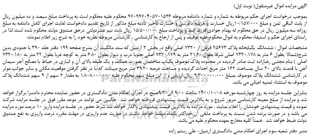 مشخصات اموال : ششدانگ یکبابخانه پلاک 25673 فرعی از 7320 اصلی واقع در بخش 2 اردبیل که سند مالکیت آن بشرح صفحه 199 دفتر جلد 390 با حدودی بدین شرح(شمالا بطول 6 متر به 7320.178 اصلی شرقا بطول 21.60 متر به 7320.179 اصلی جنوبا درب و دیوار بطول 6.80 متر به کوچه غربا بطول 22 متر به 7320.180 اصلی ) بنام مجتبی رضازاده ثبت صادر گردیده در محدوده پلاک موصوف یکباب ساختمان بصورت همکف و یک طبقه بالای آن و انباری در حیاط با مصالح آجر سیمان آهن با قدمت بالای 20 سال بمساحت 162 متر مربع احداث گردیده و مساحت عرصه 39.20 متر مربع میباشد که با در نظر گرفتن موقعیت مکانی و سایر جوانب موثر در کارشناسی ششدانگ پلاک موصوف بمبلغ 9.300.000.000 ریال ارزیابی و از این مبلغ سهم محکوم علیه 1.808.000.000 به مقدار 2 سهم از 9 سهم ششدانگ پلاک موصوف به استثناء ثمنیه اعیانی می باشد.