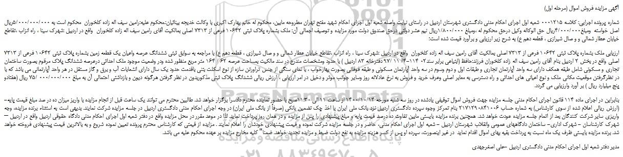شماره پرونده اجرایی: کلاسه 0001215 شعبه اول اجرای احکام مدنی دادگستری شهرستان اردبیل در راستای نیابت واصله شعبه اول اجرای احکام شهید مفتح تهران مطروحه مابین، محکوم له خانم بهارک اکبری با وکالت خدیجه بینائیان:.محکوم علیه:رامین سیف اله زاده کلخوران محکوم است به 5/000/000/000ریال اصل خواسته ومبلغ4/000/000ریال حق الوکاله وکیل درحق محکوم له ،ومبلغ 1/800/000ریال نیم عشر دولتی درحق صندوق دولت مورد مزایده و توصیف اجمالی آن: ملک بشماره پلاک ثبتی 10642 فرعی از 7313 اصلی بمالکیت آقای رامین سیف اله زاده کلخوران واقع در اردبیل :شهرک سینا ، راه انزاب ،تقاطع خیابان عطار شمالی و و صال شیرازی ، قطعه دهم ع) به شرح زیر ارزیابی و برآورد قیمت شده است؛