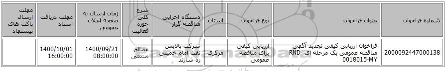 | 2000092447000138 | فراخوان ارزیابی کیفی تجدید آگهی مناقصه عمومی یک مرحله ای RND-0018015-MY | ارزیابی کیفی برای مناقصه عمومی | مرکزی | شرکت پالایش نفت امام خمینی ره شازند | مصالح صنعتی | 1400/09/21 08:00:00 | 1400/10/01 16:00:00 |