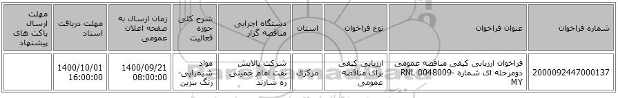 مناقصه، فراخوان ارزیابی کیفی مناقصه عمومی دومرحله ای شماره RNL-0048009-MY, فراخوان ارزیابی کیفی مناقصه عمومی دومرحله ای شماره RNL-0048009-MY