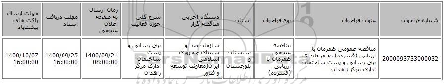 | 2000093733000032 | مناقصه عمومی همزمان با ارزیابی (فشرده) دو مرحله ای برق رسانی و پست ساختمان اداری مرکز زاهدان | مناقصه عمومی همزمان با ارزیابی (فشرده) | سیستان و بلوچستان | سازمان صدا و سیمای جمهوری اسلامی ایران(معاونت توسعه و فناور | برق رسانی و پست ساختمان اداری مرکز زاهدان | 1400/09/21 08:00:00 | 1400/09/25 16:00:00 | 1400/10/07 16:00:00 |
