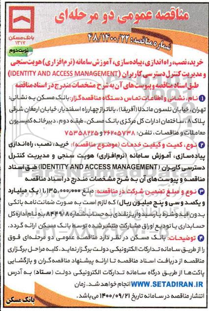 خرید، نصب، راه اندازی، پیاده سازی ، آموزش سامانه (نرم افزاری) هویت سنجی و مدیریت کنترل دسترسی کاربران (IDENTITY AND ACCESS MANAGEMENT ) طبق اسناد مناقصه و پیوست های آن به شرح مشخصات مندرج در اسناد مناقصه