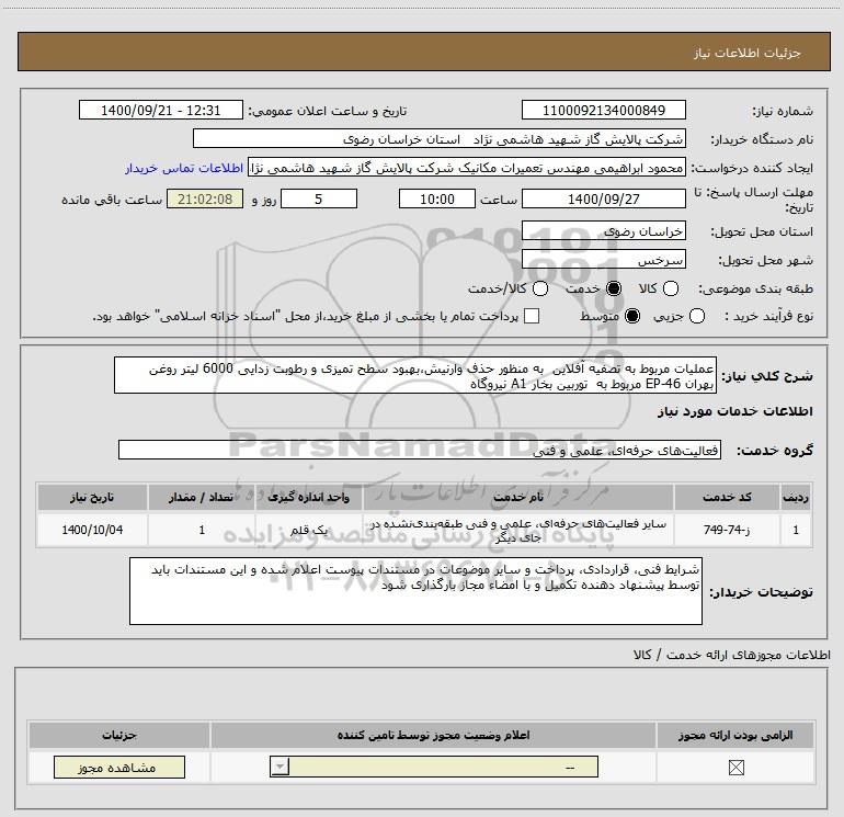 نام دستگاه خریدار:شرکت پالایش گاز شهید هاشمی نژاد استان خراسان رضوی