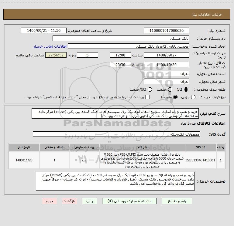 توضیحات خریدار:خرید و نصب و راه اندازی سوئیچ انتقال اتوماتیک برق سیستم های خنک کننده بین رکی (inrow) مرکز داده ساختمان فردوسی بانک مسکن (طبق قرارداد و الزامات پیوست) - ایران کد مشابه و صرفاً جهت قیمت گذاری برای کل درخواست می باشد