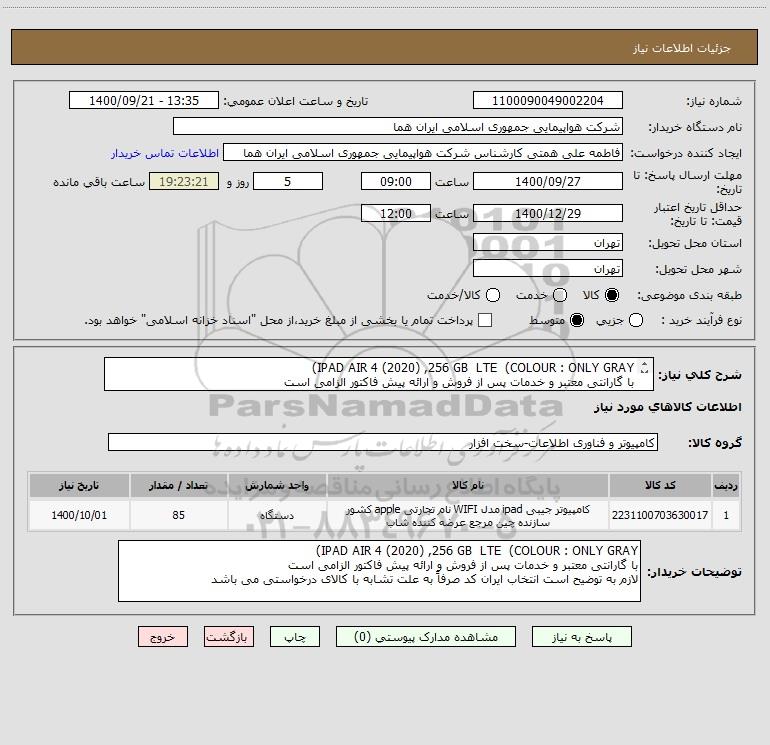 استعلام IPAD AIR 4 (2020) ,256 GB LTE (COLOUR : ONLY GRAY) با گارانتی معتبر و خدمات پس از فروش و ارائه پیش فاکتور الزامی است , استعلام IPAD AIR 4 (2020) ,256 GB LTE (COLOUR : ONLY GRAY) با گارانتی معتبر و خدمات پس از فروش و ارائه پیش فاکتور الزامی است