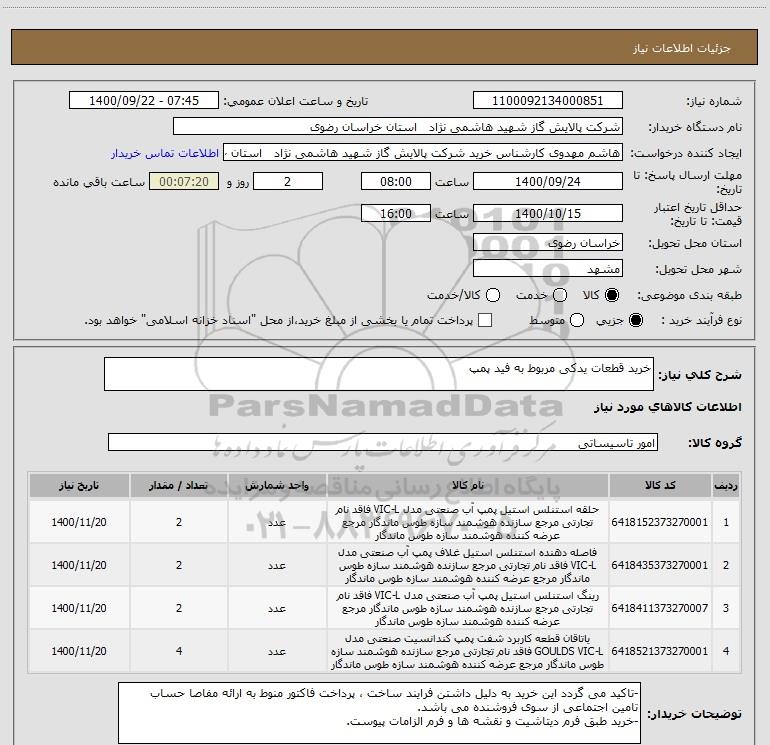 شرح کلی نیاز: خرید قطعات یدکی مربوط به فید پمپ