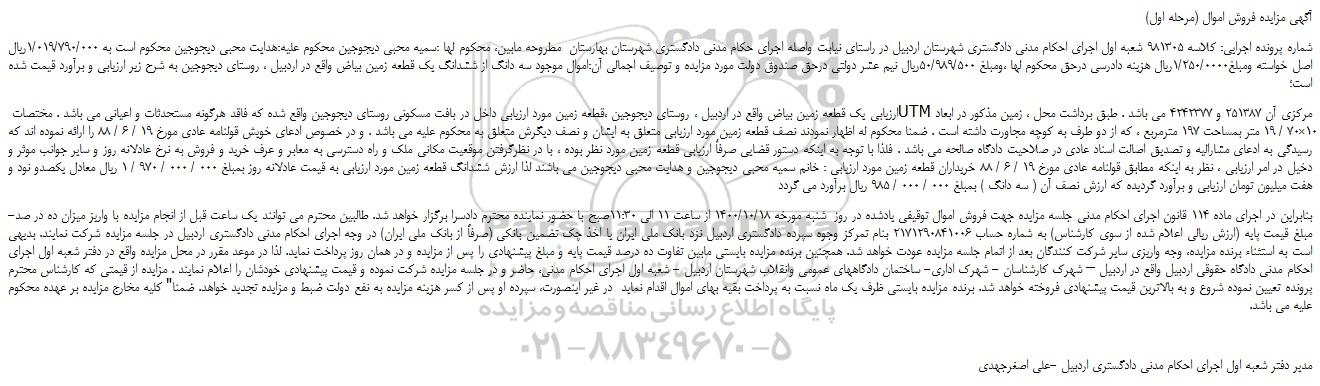 شماره پرونده اجرایی: کلاسه 981305 شعبه اول اجرای احکام مدنی دادگستری شهرستان اردبیل در راستای نیابت واصله اجرای حکام مدنی دادگستری شهرستان بهارستان مطروحه مابین، محکوم لها :سمیه محبی دیجوجین محکوم علیه:هدایت محبی دیجوجین محکوم است به 1/019/790/000ریال اصل خواسته ومبلغ1/250/0000ریال هزینه دادرسی درحق محکوم لها ،ومبلغ 50/989/500ریال نیم عشر دولتی درحق صندوق دولت مورد مزایده و توصیف اجمالی آن:اموال موجود سه دانگ از ششدانگ یک قطعه زمین بیاض واقع در اردبیل ، روستای دیجوجین به شرح زیر ارزیابی و برآورد قیمت شده است؛