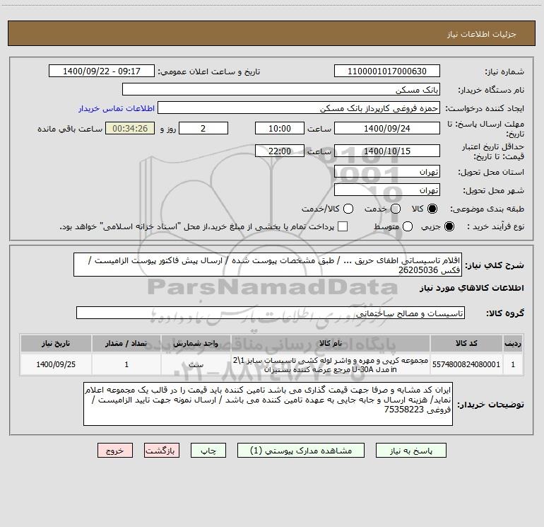 شرح کلی نیاز: اقلام تاسیساتی اطفای حریق ... / طبق مشخصات پیوست شده / ارسال پیش فاکتور پیوست الزامیست / فکس 26205036