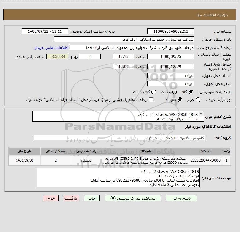 توضیحات خریدار:WS-C3850-48TS به تعداد 2 دستگاه. ایران کد صرفا جهت تشابه. اطلاعات بیشتر تماس با آقای صادقی 09122379586 در ساعت اداری. نحوه پرداخت مالی 3 ماهه اداری.