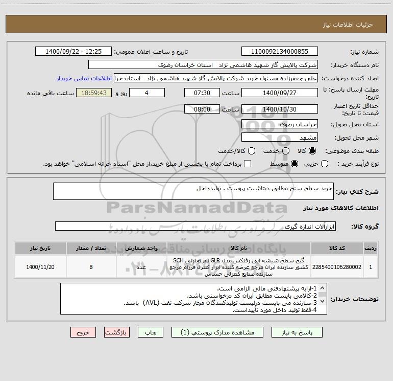 نام دستگاه خریدار:شرکت پالایش گاز شهید هاشمی نژاد استان خراسان رضوی