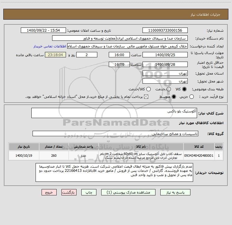 استعلام بها و موضوع استعلام استعلام آکوستیک بلو باکس به اطلاع کلیه شرکت‌ها و افراد متخصص واجد شرایط می‌رساند، آگهی گذار در نظر دارد از طریق استعلام بها، نسبت به انتخاب و دریافت پیشنهادات اقدام نماید. این استعلام با کد آگهی ثبت شده در سامانه خبرگزاری پارس نماد : 4053425 منتشر شده است. مشخصات استعلام : تاریخ شروع استعلام: 1400/09/22 آخرین مهلت ارسال پیشنهاد قیمت : 1400/09/24 و محل اجرای پروژه : استان تهران میباشد. استعلام قیمت مورد درخواست : استعلام آکوستیک بلو باکس با دسته‌بندی‌های تخصصی و گروه های مرتبط : دکوراسیون داخلی, مصالح ساختمانی, استعلام اطلاع رسانی میگردد.