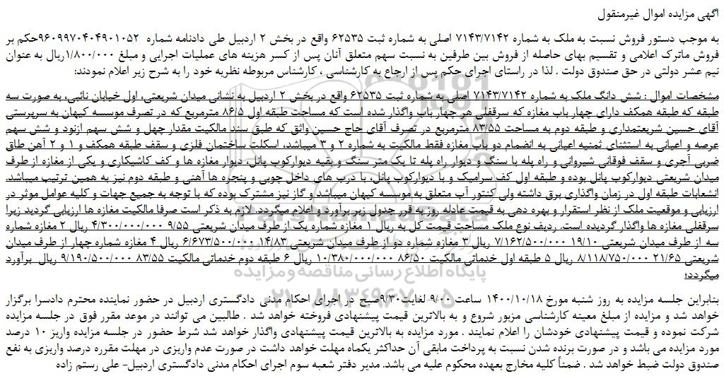 به موجب دستور فروش نسبت به ملک به شماره 7143/7142 اصلی به شماره ثبت 62535 واقع در بخش 2 اردبیل طی دادنامه شماره 9609970404901052حکم بر فروش ماترک اعلامی و تقسیم بهای حاصله از فروش بین طرفین به نسبت سهم متعلق آنان پس از کسر هزینه های عملیات اجرایی و مبلغ 1/800/000ریال به عنوان نیم عشر دولتی در حق صندوق دولت . لذا در راستای اجرای حکم پس از ارجاع به کارشناسی ، کارشناس مربوطه نظریه خود را به شرح زیر اعلام نمودند: