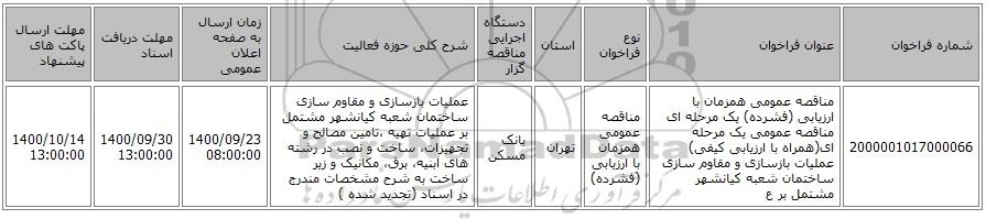 2000001017000066 | مناقصه عمومی همزمان با ارزیابی (فشرده) یک مرحله ای مناقصه عمومی یک مرحله ای(همراه با ارزیابی کیفی) عملیات بازسازی و مقاوم سازی ساختمان شعبه کیانشهر مشتمل بر ع | مناقصه عمومی همزمان با ارزیابی (فشرده) | تهران | بانک مسکن | عملیات بازسازی و مقاوم سازی ساختمان شعبه کیانشهر مشتمل بر عملیات تهیه ،تامین مصالح و تجهیزات، ساخت و نصب در رشته های ابنیه، برق، مکانیک و زیر ساخت به شرح مشخصات مندرج در اسناد (تجدید شده ) | 1400/09/23 08:00:00 | 1400/09/30 13:00:00 | 1400/10/14 13:00:00 |