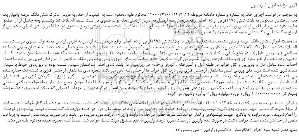 به موجب درخواست اجرای حکم به شماره و شماره دادنامه مربوطه 140007390001419942 محکوم علیه محکوم است به تبعیت از حکم به فروش ماترک شش دانگ عرصه واعیان یک باب ساختمان مسکونی به پلاک ثبتی 2995فرعی از 115اصلی واقع دربخش سه اردبیل به آدرس اردبیل محله نواب صفوی بن بست سیف اله پلاک 55 وتقسیم وجه حاصل از آن مطابق نظریه کارشناسی برابر قانون ارث بین وراث مرحوم فرامرز حیدری ازبابت اصل خواسته و مبلغ 1/800/000ریال بابت نیم عشردولتی درحق صندوق دولت لذا در راستای اجرای حکم پس از ارجاع به کارشناسی ، کارشناس مربوطه نظریه خود را به شرح زیر اعلام نمودند: