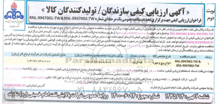 شرکت پالایش نفت امام خمینی در نظر دارد فراخوان ارزیابی کیفی جهت برگزاری تجدید مناقصه عمومی انواع پیچ و مهره شماره مناقصه RNL-9947001-RW&RNL-9947002-TW و شماره فراخوان 2000092447000104 را از طریق سامانه تدارکات الکترونیکی دولت برگزار نماید کلیه مراحل برگزاری فراخوان ارزیابی کیفی از دریافت و تحویل اسناد استعلام ارزیابی کیفی تا ارسال دعوتنامه جهت سایر مراحل مناقصه از طریق درگاه سامانه تدارکات الکترونیکی دولت ستاد به آدرس ستاد ایران انجام خواهد شد لازم است مناقصه گران در صورت عدم عضویت قبلی مراحل ثبت نام در سایت مذکور و دریافت گواهی امضای الکترونیکی ار جهت شرکت در مناقصه محقق سازند تاریخ انتشار فراخوان در سامانه تاریخ 1400.9.23می باشد اطلاعات و اسناد مناقصه عمومی پس از برگزاری فرایند ارزیابی کیفی و ارسال دعوتنامه از طریق سامانه ستاد به مناقصه گران ارسال خواهد شد .