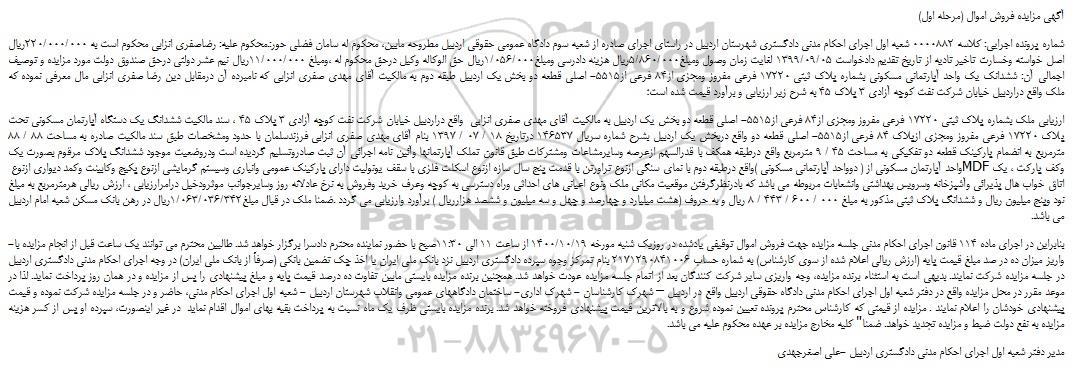 شماره پرونده اجرایی: کلاسه 0000882 شعبه اول اجرای احکام مدنی دادگستری شهرستان اردبیل در راستای اجرای صادره از شعبه سوم دادگاه عمومی حقوقی اردبیل مطروحه مابین، محکوم له سامان فضلی حور:.محکوم علیه: رضاصفری انزابی محکوم است به 220/000/000ریال اصل خواسته وخسارت تاخیر تادیه از تاریخ تقدیم دادخواست 1399/09/05 لغایت زمان وصول ومبلغ5/860/000ریال هزینه دادرسی ومبلغ1/056/000ریال حق الوکاله وکیل درحق محکوم له ،ومبلغ 11/000/000ریال نیم عشر دولتی درحق صندوق دولت مورد مزایده و توصیف اجمالی آن: ششدانک یک واحد آپارتمانی مسکونی بشماره پلاک ثبتی 17220 فرعی مفروز ومجزی از84 فرعی از5515- اصلی قطعه دو بخش یک اردبیل طبقه دوم به مالکیت آقای مهدی صفری انزابی که نامبرده آن درمقابل دین رضا صفری انزابی مال معرفی نموده که ملک واقع دراردبیل خیابان شرکت نفت کوچه آزادی 3 پلاک 45 به شرح زیر ارزیابی و برآورد قیمت شده است؛