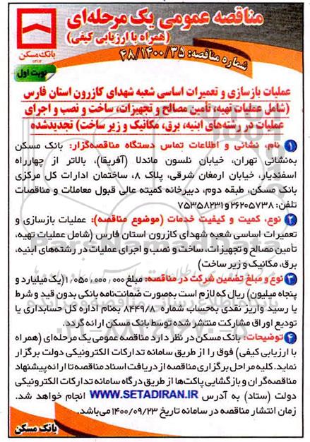 عملیات بازسازی و تعمیرات اساسی شعبه شهدای کازرون استان فارس (شامل عملیات تهیه ، تامین مصالح و تجهیزات ، حمل ، ساخت و نصب و اجرای عملیات در رشته های ابنیه ، برق ، مکانیک و زیرساخت ) تجدید شده