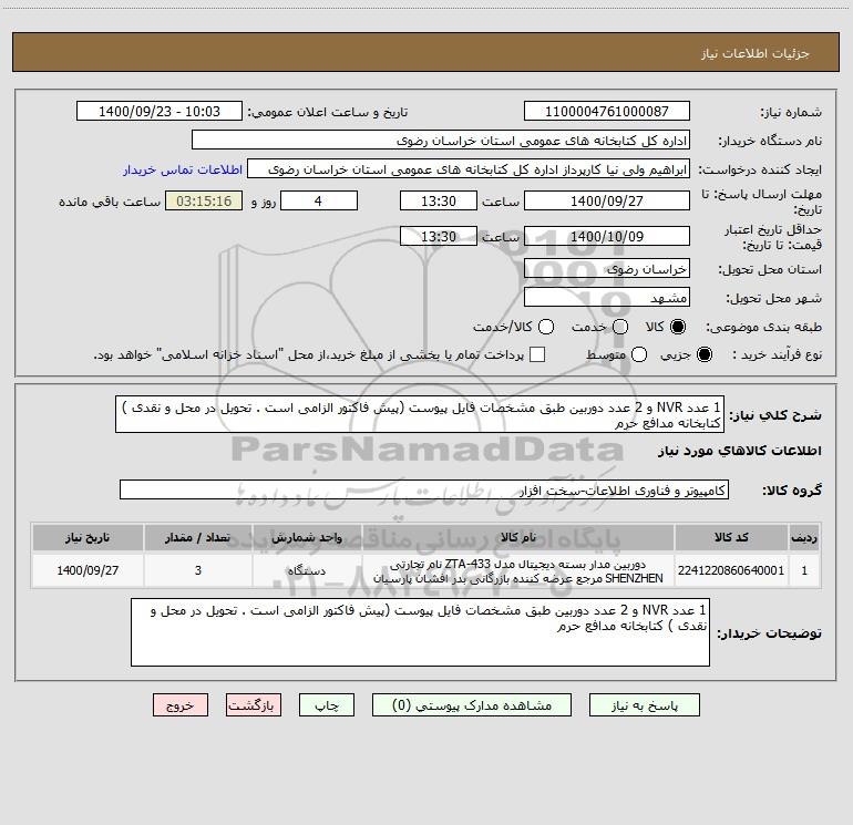 شرح کلی نیاز: 1 عدد NVR و 2 عدد دوربین طبق مشخصات فایل پیوست (پیش فاکتور الزامی است . تحویل در محل و نقدی ) کتابخانه مدافع حرم