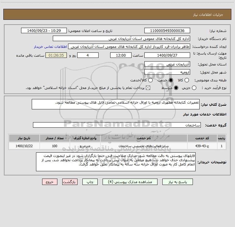 شرح کلی نیاز: تعمیرات کتابخانه مطهری ارومیه با اوراق خزانه اسلامی-تمامی فایل های پیوستی مطالعه شود.