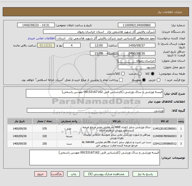 نام دستگاه خریدار:شرکت پالایش گاز شهید هاشمی نژاد استان خراسان رضوی