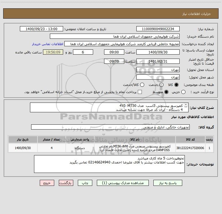 شرح کلی نیاز: کمپرسور پیستونی 3اسب مدل 4VI- MT50