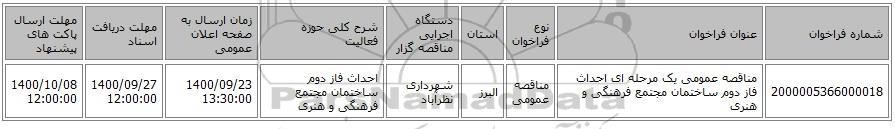 | 2000005366000018 | مناقصه عمومی یک مرحله ای احداث فاز دوم ساختمان مجتمع فرهنگی و هنری | مناقصه عمومی | البرز | شهرداری نظرآباد | احداث فاز دوم ساختمان مجتمع فرهنگی و هنری | 1400/09/23 13:30:00 | 1400/09/27 12:00:00 | 1400/10/08 12:00:00 |