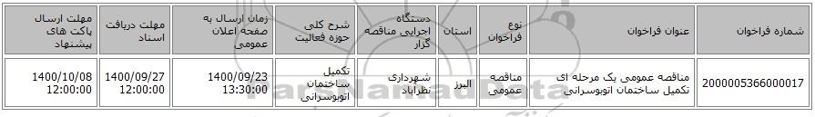 | 2000005366000017 | مناقصه عمومی یک مرحله ای تکمیل ساختمان اتوبوسرانی | مناقصه عمومی | البرز | شهرداری نظرآباد | تکمیل ساختمان اتوبوسرانی | 1400/09/23 13:30:00 | 1400/09/27 12:00:00 | 1400/10/08 12:00:00 |