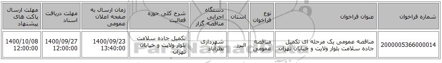 | 2000005366000014 | مناقصه عمومی یک مرحله ای تکمیل جاده سلامت بلوار ولایت و خیابان تهران | مناقصه عمومی | البرز | شهرداری نظرآباد | تکمیل جاده سلامت بلوار ولایت و خیابان تهران | 1400/09/23 13:40:00 | 1400/09/27 12:00:00 | 1400/10/08 12:00:00 |