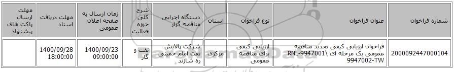 | 2000092447000104 | فراخوان ارزیابی کیفی تجدید مناقصه عمومی یک مرحله ای RNL-9947001\ 9947002-TW | ارزیابی کیفی برای مناقصه عمومی | مرکزی | شرکت پالایش نفت امام خمینی ره شازند | نفت و گاز | 1400/09/23 09:00:00 | 1400/09/28 18:00:00 |