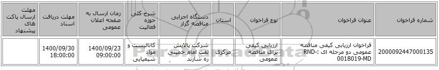 | 2000092447000135 | فراخوان ارزیابی کیفی مناقصه عمومی دو مرحله ای :RND-0018019-MD | ارزیابی کیفی برای مناقصه عمومی | مرکزی | شرکت پالایش نفت امام خمینی ره شازند | کاتالیست و مواد شیمیایی | 1400/09/23 09:00:00 | 1400/09/30 18:00:00 |