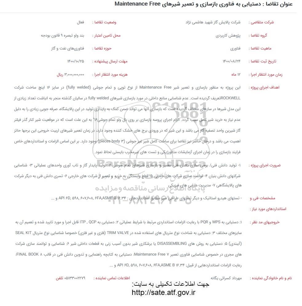 فراخوان دستیابی به فناوری بازسازی و تعمیر شیرهای Maintenance free, فراخوان دستیابی به فناوری بازسازی و تعمیر شیرهای Maintenance free