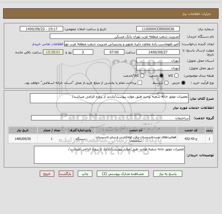 استعلام تعمیرات موتور خانه شعبه توحید طبق موارد پیوست/بازدید از پروره الزامی میباشد/, استعلام تعمیرات موتور خانه شعبه توحید طبق موارد پیوست/بازدید از پروره الزامی میباشد/
