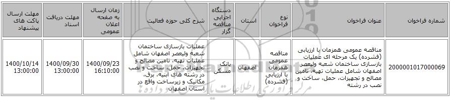2000001017000069 | مناقصه عمومی همزمان با ارزیابی (فشرده) یک مرحله ای عملیات بازسازی ساختمان شعبه ولیعصر اصفهان شامل عملیات تهیه، تامین مصالح و تجهیزات، حمل، ساخت و نصب در رشته | مناقصه عمومی همزمان با ارزیابی (فشرده) | اصفهان | بانک مسکن | عملیات بازسازی ساختمان شعبه ولیعصر اصفهان شامل عملیات تهیه، تامین مصالح و تجهیزات، حمل، ساخت و نصب در رشته های ابنیه، برق، مکانیک و زیرساخت واقع در استان اصفهان | 1400/09/23 16:10:00 | 1400/09/30 13:00:00 | 1400/10/14 13:00:00 |