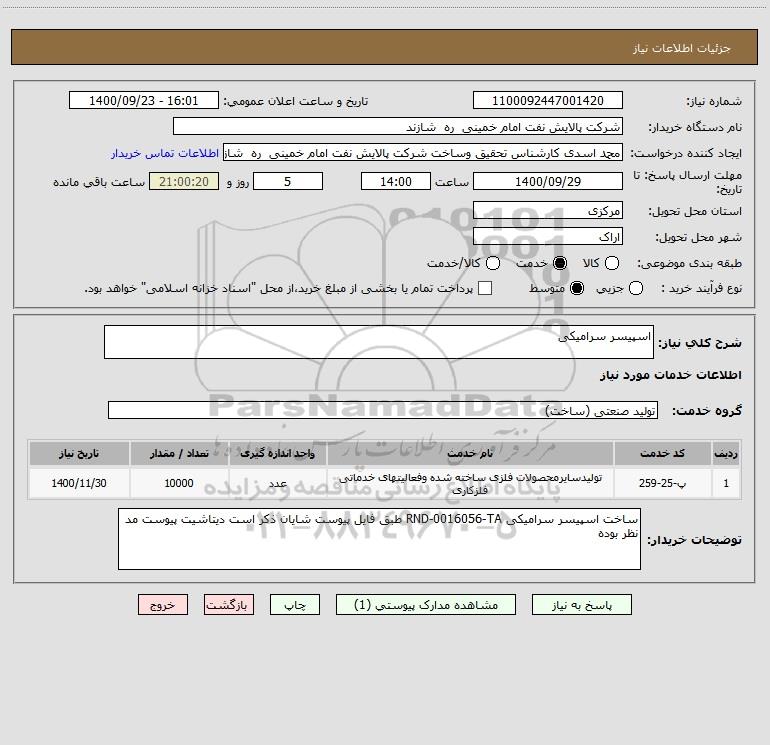 استعلام بها و موضوع استعلام استعلام اسپیسر سرامیکی به اطلاع کلیه شرکتها و افراد متخصص واجد شرایط میرساند، آگهی گذار در نظر دارد از طریق استعلام بها، نسبت به انتخاب و دریافت پیشنهادات اقدام نماید. این استعلام با کد آگهی ثبت شده در سامانه خبرگزاری پارس نماد : 4057303 منتشر شده است. مشخصات استعلام : تاریخ شروع استعلام: 1400/09/23 آخرین مهلت ارسال پیشنهاد قیمت : 1400/09/28 و محل اجرای پروژه : استان مرکزی میباشد. استعلام قیمت مورد درخواست : استعلام اسپیسر سرامیکی با دستهبندیهای تخصصی و گروه های مرتبط : خدمات صنعتی, انواع مواد و قطعات نسوز, سازه های فلزی و فضایی, پیمانکاری نفت و گاز و پتروشیمی, تجهیزات نفت و گاز, تجهیزات و ماشین آلات صنعتی, استعلام اطلاع رسانی میگردد.