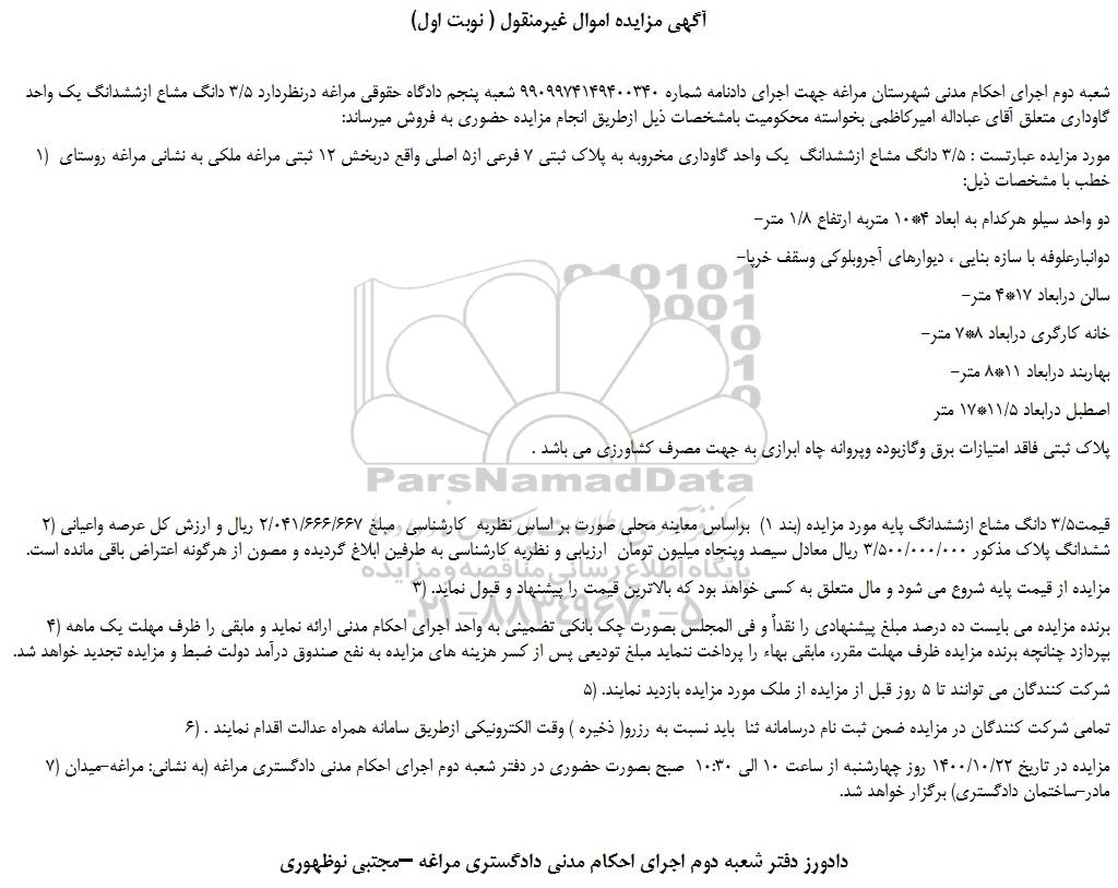 شعبه دوم اجرای احکام مدنی شهرستان مراغه جهت اجرای دادنامه شماره 9909974149400340 شعبه پنجم دادگاه حقوقی مراغه درنظردارد 3/5 دانگ مشاع ازششدانگ یک واحد گاوداری متعلق آقای عباداله امیرکاظمی بخواسته محکومیت بامشخصات ذیل ازطریق انجام مزایده حضوری به فروش میرساند: