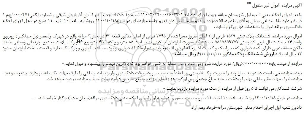 - مزایده در تاریخ 1400/10/18روز شنبه ساعت 10 لغایت 11 صبح بصورت حضوری درشعبه اول اجرای احکام مدنی دادگستری مراغه(میدان مادر ) برگزار خواهد شد.